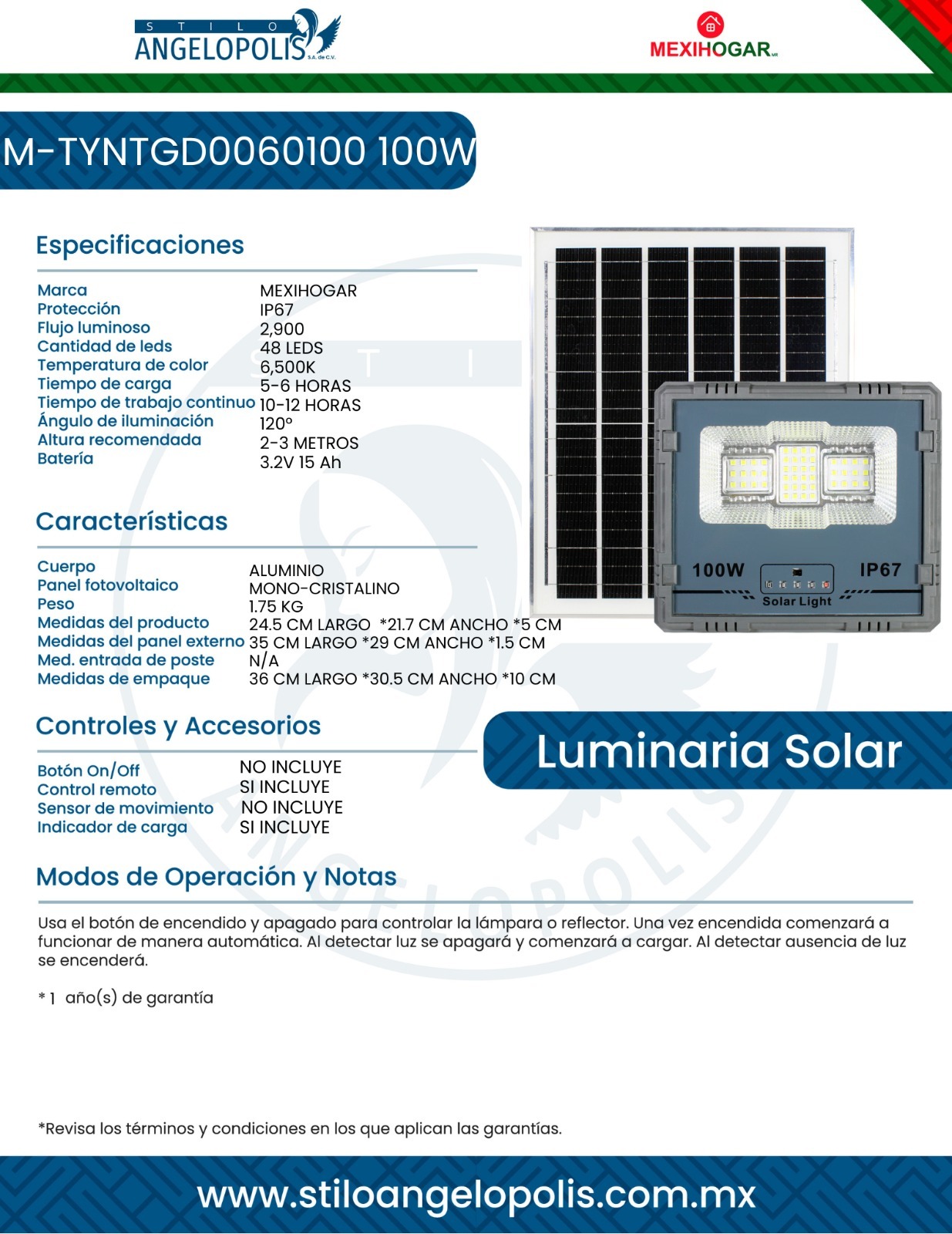 Reflector Solar LED Alta Dirección de Iluminación 100W MEXIHOGAR Diseñado para iluminar el área requerida ademas de gran alcance justo donde la necesitas. Este equipo te garantiza un haz de luz potente y uniforme, perfecto para proyectos de gran escala, como fachadas, zonas industriales, campos deportivos o áreas de seguridad.